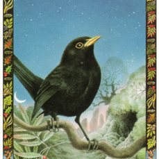 Il Merlo canta nuove notizie, è la forza animale di Hermes (Mercurio per i Romani). È colui che comunica, informa e divulga. Il Merlo esce dalla grotta, dal buio, portando al mondo notizie. Ci invita ad uscire dalla nostra zona interiore, ci chiama al dialogo, al comunicare il nostro stato, i nostri desideri, il nostro sapere. Non può rimanere tutto dentro. Il Merlo è pronto a far sentire il suo canto e a modulare il canto altrui, reagisce a tono e con intelligenza al contro canto, alle parole dette. Conosce il potere delle parole. Inoltre, il merlo è accompagnato dalla runa Ansuz (in basso a destra), la runa del suono soprattutto nella lingua intesa come comunicazione intelligente e della consapevolezza. Significa onestà, messaggi, incontri e successo in un esame o un test.